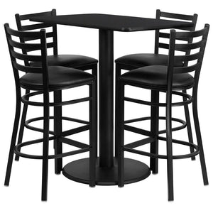 This set includes an elegant Black Laminate Table Top, Round Base and 4 Metal Ladder Back Barstools. Surface is heat, scratch and moisture resistant. Easily clean using a mild detergent and water, dry clean to keep your tables spotless. Use this setup in sports bars, banquet halls, restaurants, break room/cafeteria settings or any other social gathering. Mix in bar height tables with standard height tables for a more varied seating selection.