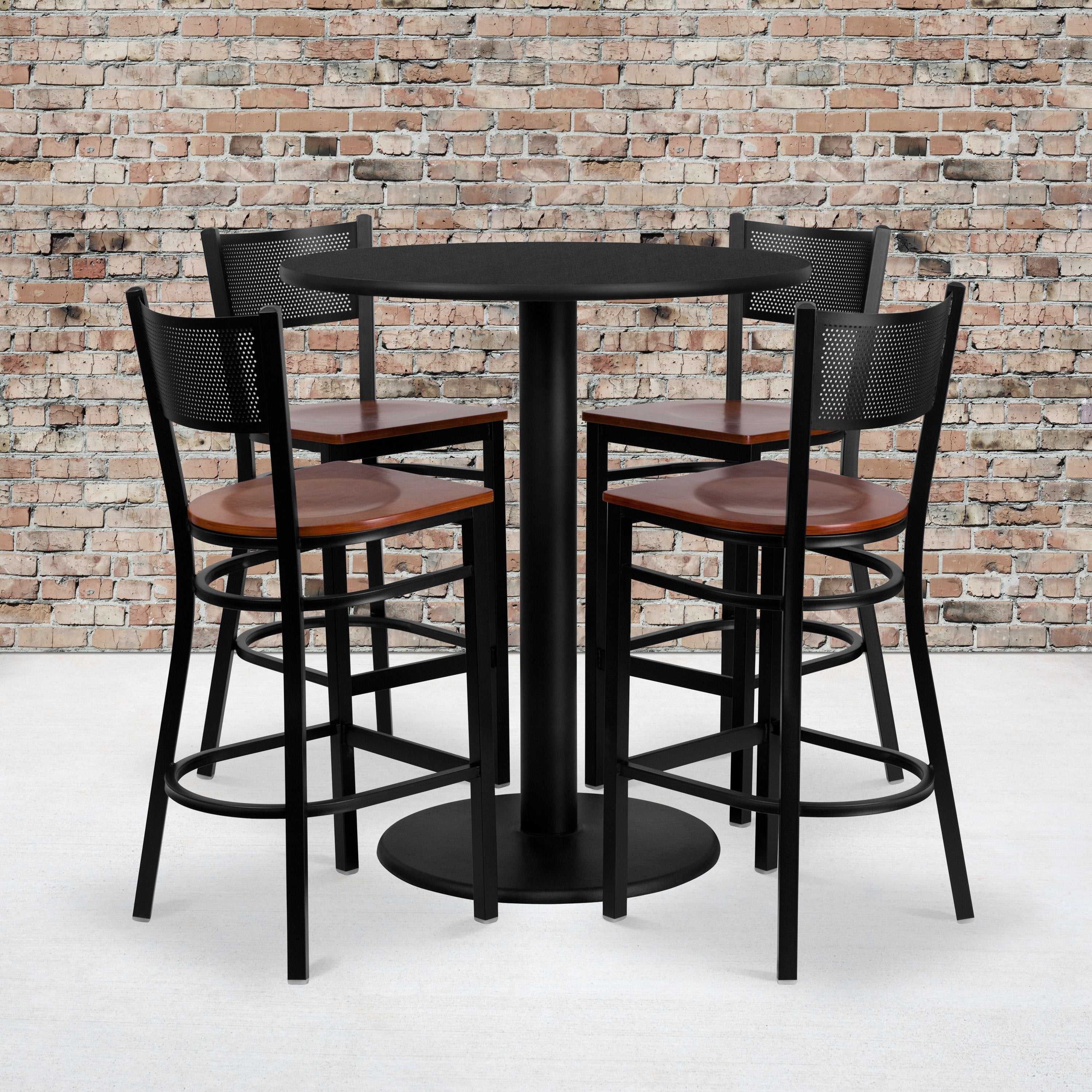 36'' Round Black Laminate Table Set with 4 Grid Back Metal Barstools - Cherry Wood Seat (MD-0018-GG)