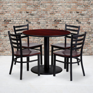 36'' Round Mahogany Laminate Table Set with 4 Ladder Back Metal Chairs - Mahogany Wood Seat (MD-0004-GG)