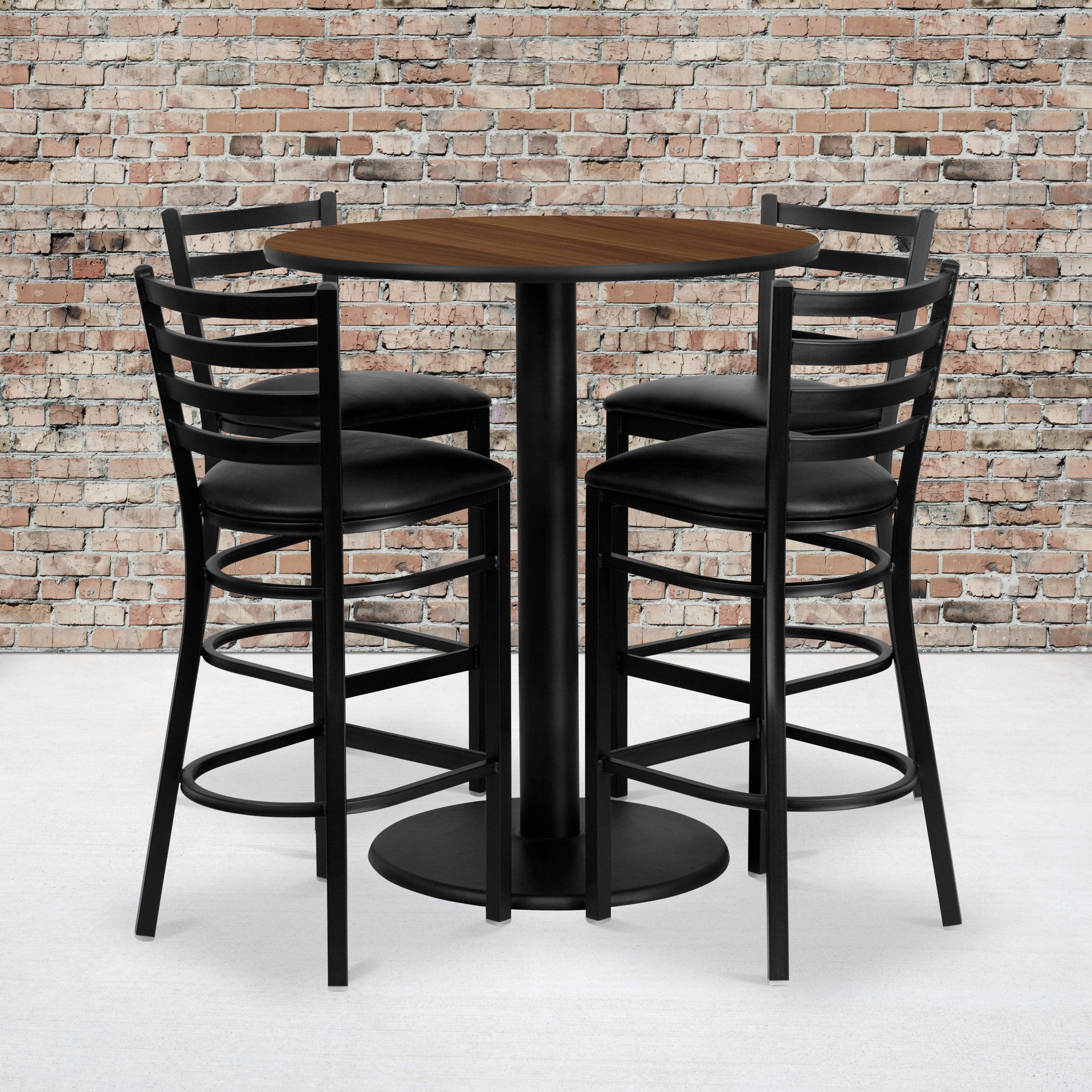 36'' Round Walnut Laminate Table Set with 4 Ladder Back Metal Barstools - Black Vinyl Seat (MD-0011-GG)