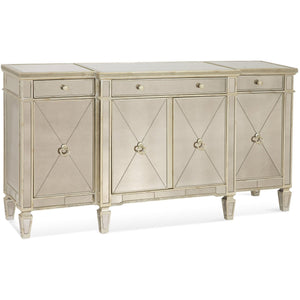 The Borghese breakfront server captures the timeless elegance of antique silvered mirror and hand worked antique silver leaf finish. Borghese features a beveled antique mirror top, encapsulated mirror panels, and meticulous edge treatments.