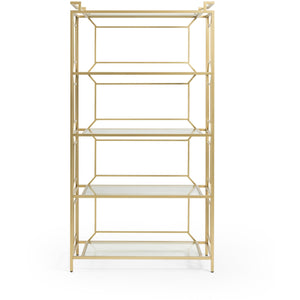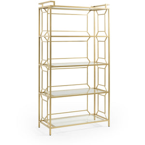On-trend Hollywood Glam style and fantastic build quality define the Naomie Etagere/Bookcase. Featuring five glass insert shelves and an intricate brass finished steel frame that has a soft satin finish and provides the perfect counterpoint to the crisp geometric glass. At home in any sunroom, coastal region, or Glam themed environment, the Naomie reflects your refined sense of style.