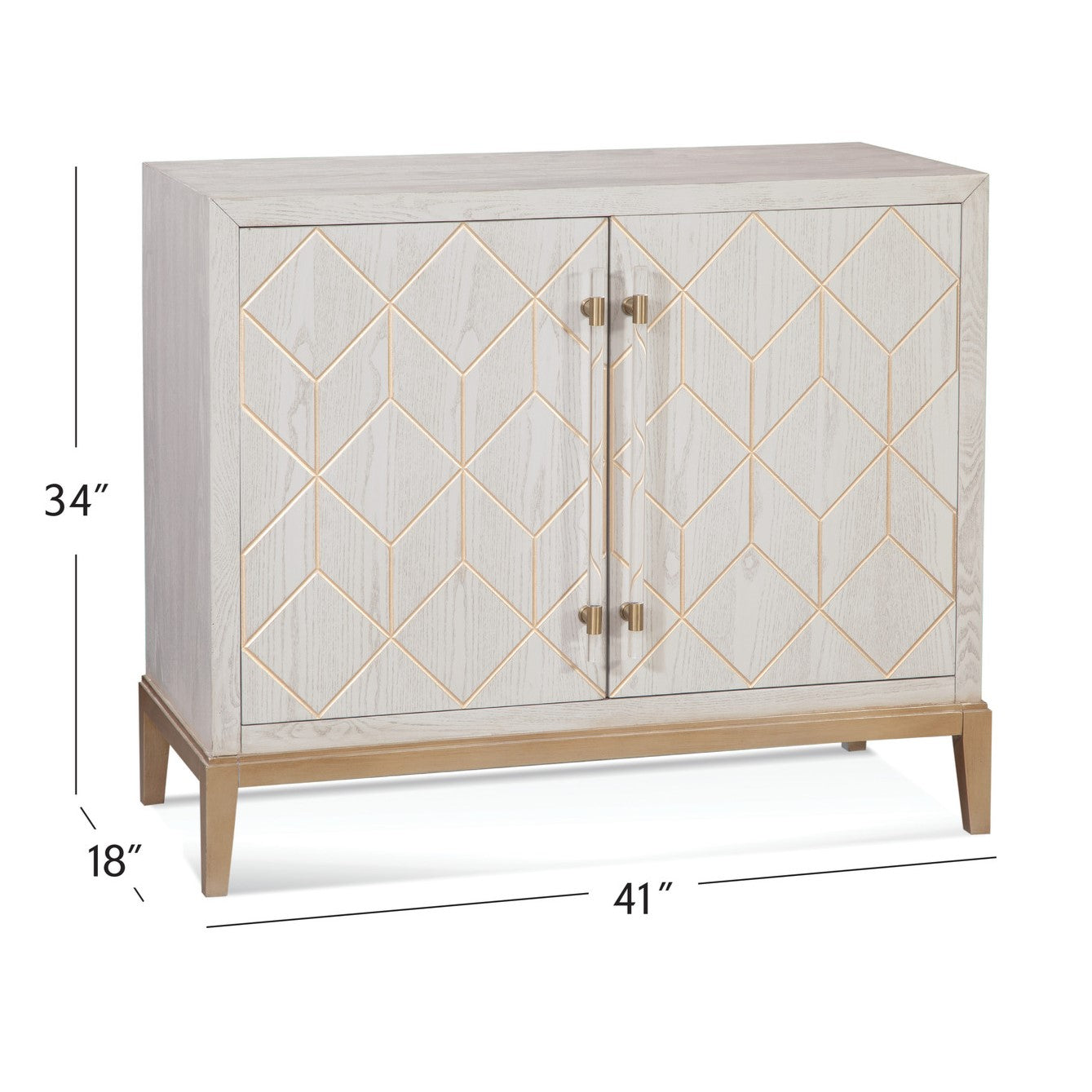 This two-door bar cabinet features a geometric design carved into the doors finished in a soft, white finish on flat cut oak veneers with a satin brass finish base. The acrylic hardware has satin brass holders. The interior is finished in a clean, white finish with a drawer for storage, a removable felt liner, holders for stemware, and a reversible shelf with slots for wine bottles.