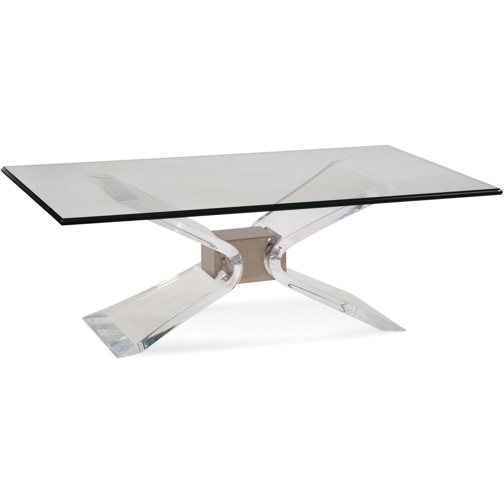 The Silven Rectangular Cocktail features a clear acrylic base with brushed nickel hardware and a clear 3/4" thick glass top with a shaped ogee edge.