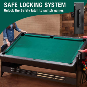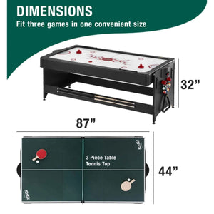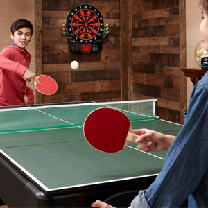 Includes all of the accessories needed to play the games you love such as pool cues and billiard balls, hockey pucks and pushers, and table tennis paddles and net.