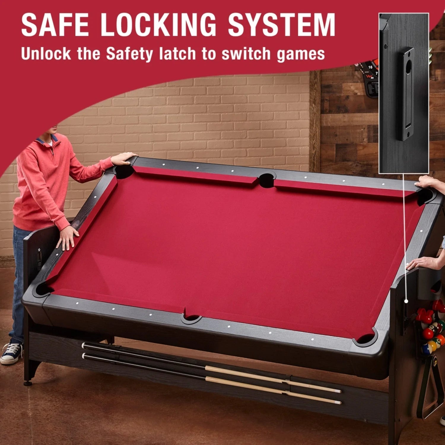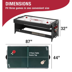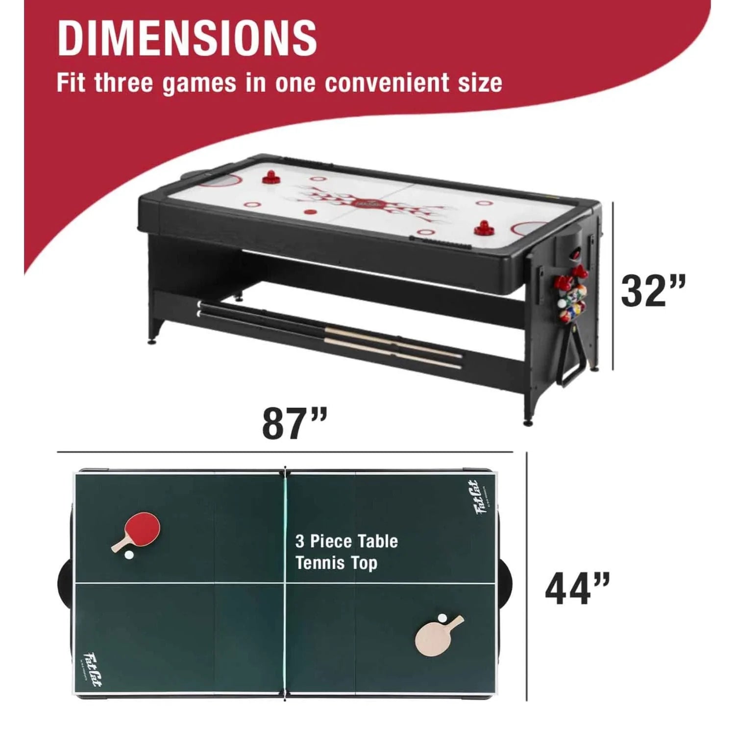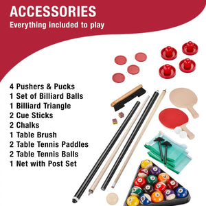 Includes all of the accessories needed to play the games you love such as pool cues and billiard balls, hockey pucks and pushers, and table tennis paddles and net.
