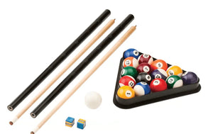 Included - Two 57” cues, two pieces of chalk, a resin triangle, a rail brush, and a set of 2.25” billiard balls