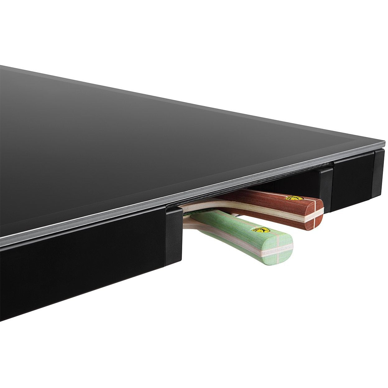 This revolutionary table is designed to look great and perform even better. Setup and storage is easy, and innovative storage pockets at each end allow for easy access to balls and paddles.