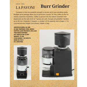 La Pavoni JRD Burr Coffee grinder. Compact in size but powerful enough to service all your grinding needs. Multiple grind settings allow you to grind from course, for drip coffee, to fine for electric espresso machines. Coffee is ground into the bottom chamber then dispensed via the side level at 7 grams per pull. Accepts all portafilter handles up to 59 mm. Features 2 hoppers, a smaller ½ lb. capacity and a large 1.7 lb. commercial size hopper (not shown).