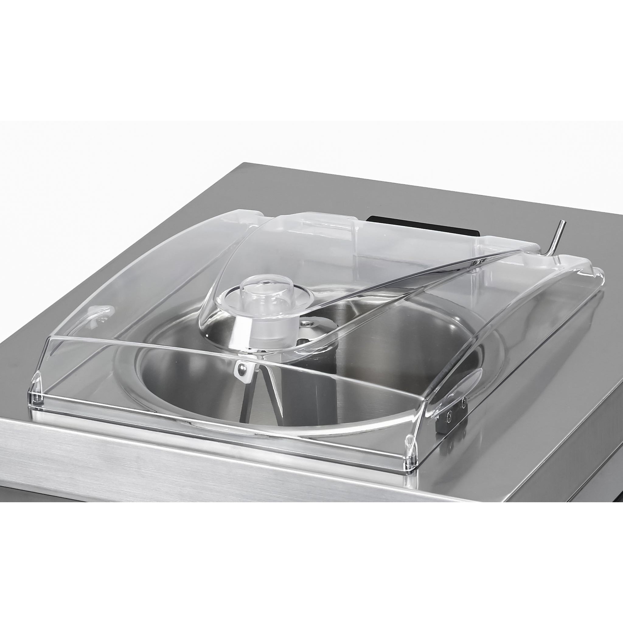 Three switches start the cooling system, the blade and the storage process. The operation is flexible, it allows to work in automatically or manually mode. For automatic operation, just press the storage button. In this way the churning cycle phase begins until the density sensor intervenes to block the blade, activating the storage. Blade and compressor, are activated to managed by the software, to keep the gelato ready for service. The body of the machines is in stainless steel as well as the mixing blade, equipped with interchangeable copolymer scrapers. The lid is equipped with an opening to allow the addition of ingredients during operation and a sensor that blocks the rotation of the blade when it is lifted. A drain system facilitates cleaning. Four wheels, two of which with brakes, make moving around easy. Aircooled, it only requires connection to a normal 10A electrical outlet.