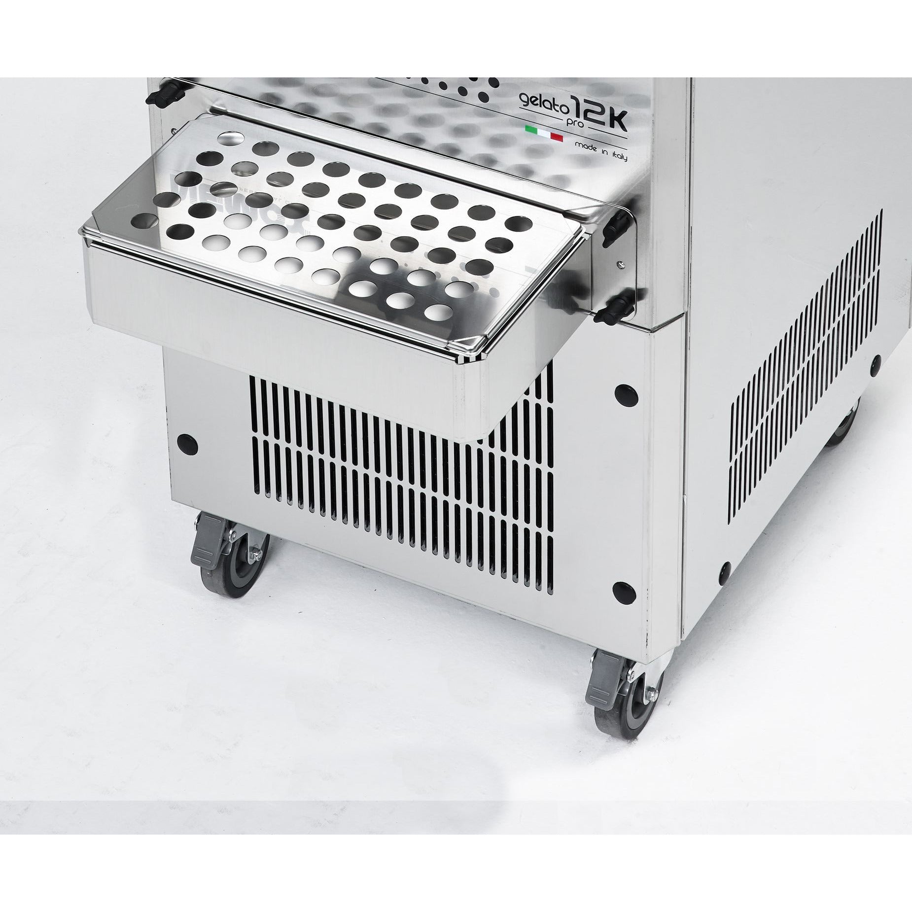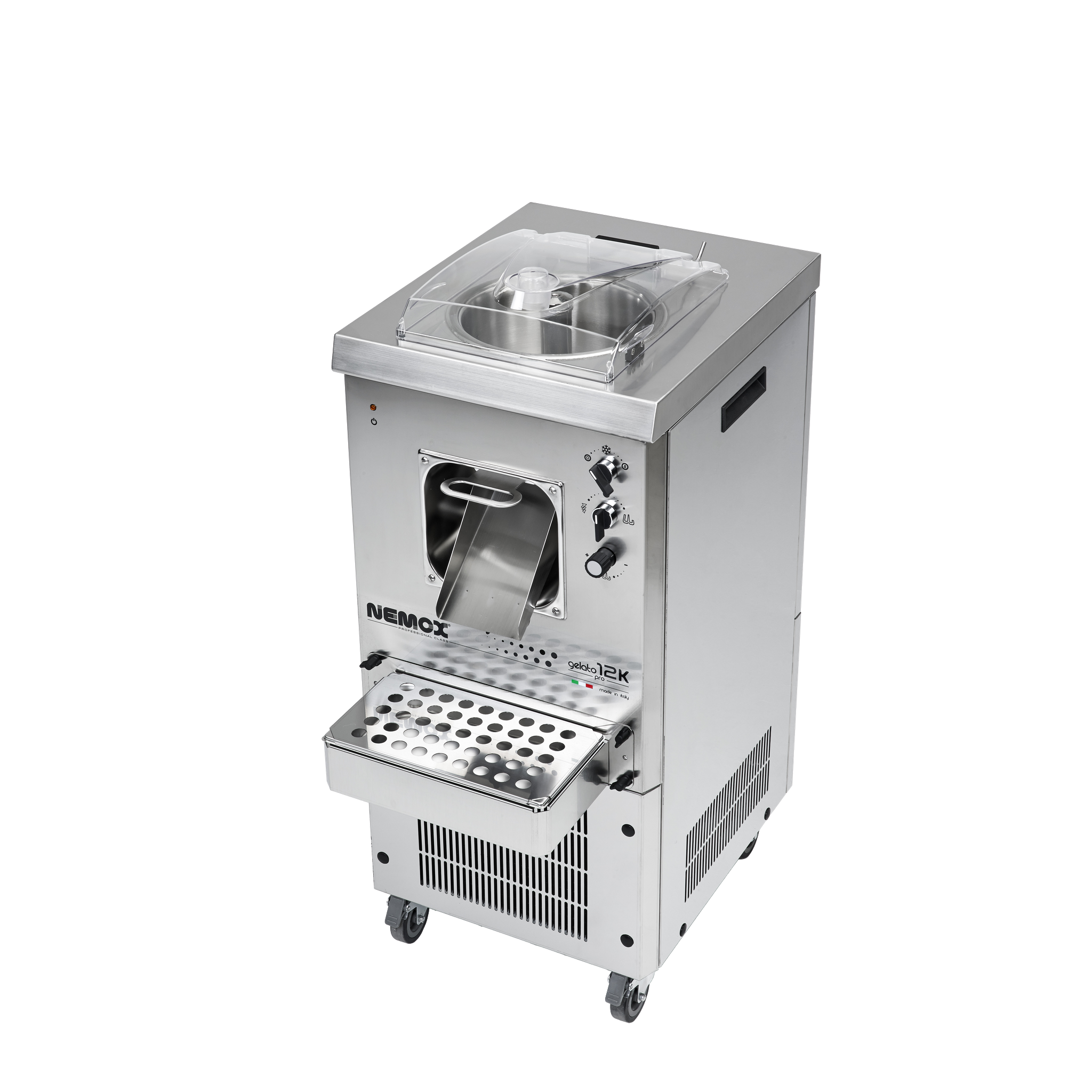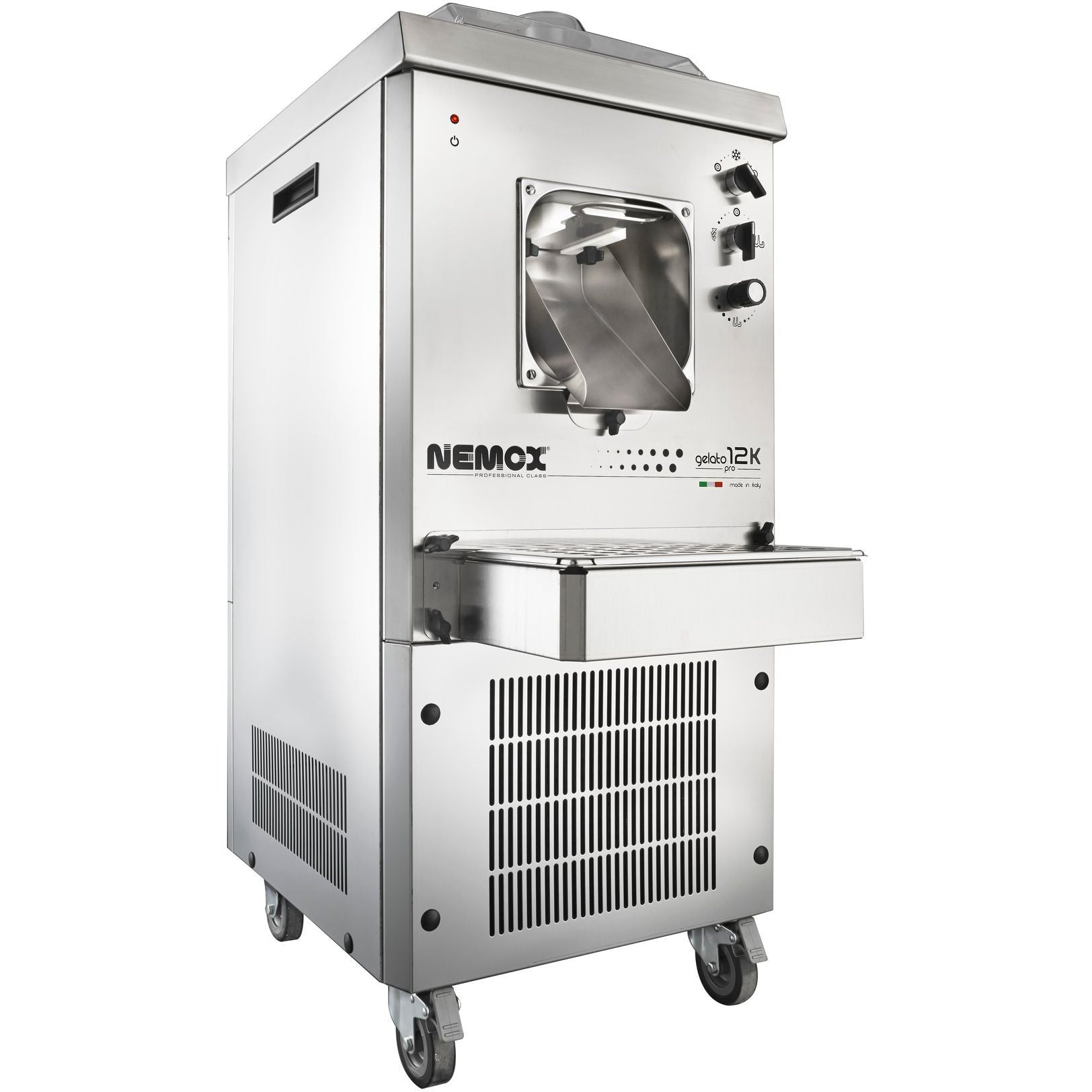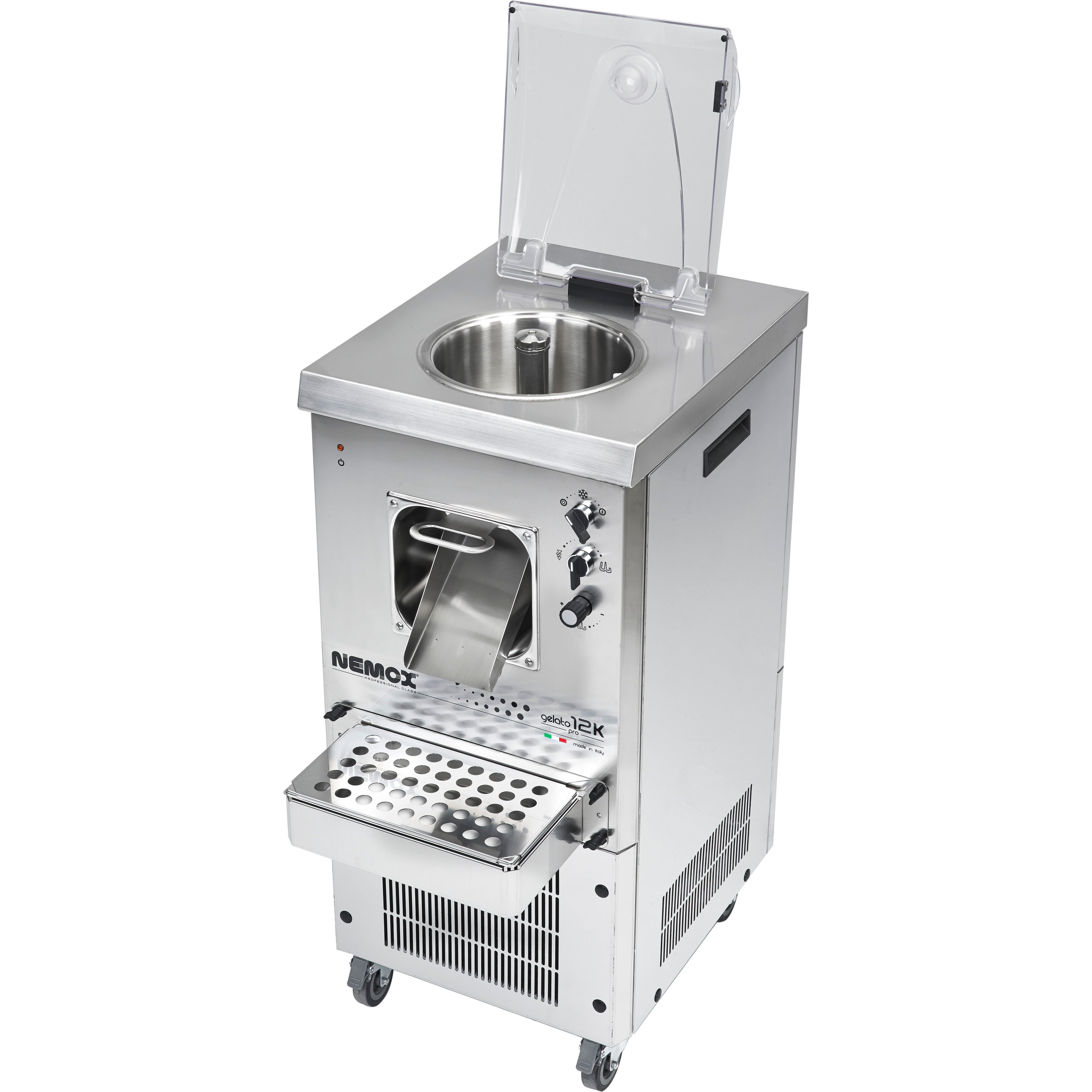 NEMOX Gelato 12K has many advanced functions and capabilities but remains very easy to use. Gelato 12K is a very powerful machine with frontal production extraction/dispensing system. Adjustable mixing paddle speed (60 to 130 rpm) guarantees the best results of each recipe! Mixing paddle motor is controlled with an electronic inverter. The gelato 12K is equipped with wheels and brakes making it easy to move around. AISI 304 stainless steel mixing paddle features adjustable scrapers. Air cooling.