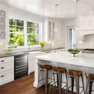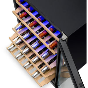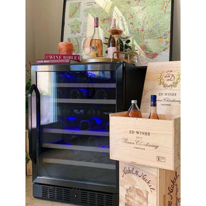 The NewAir ABR-460DB-B Dual Zone 46-Bottle Wine Cooler has enough storage space for nearly four cases of wine, and adjustable cedar shelves allow you to customize the space. The clever design of this wine fridge optimizes the interior storage capacity while keeping its footprint manageable. At less than 24 inches wide, you'll be able to incorporate it into any kitchen remodel or home wine cellar system since it's designed to slide in between standard base cabinets.