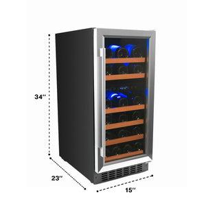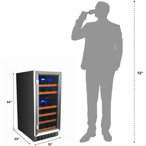 - Wine refrigerator dimensions: 34” Height x 15” Width x 23” Depth (25" including handle). Weight - 84 lbs.